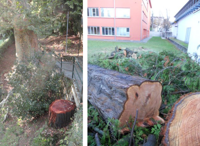 5. Parco San Michele, una conifera direttamente sotto i due platani avvelenati per la vista lago dell’ex-Kurhaus di Ruvigliana era visibilmente sofferente l’inverno scorso, ora è stata tagliata (v.foto 1, la ceppaia). Sono state eseguite delle analisi per accertare se la causa del deperimento è lo stesso veleno che ha ucciso i due importanti platani che coprivano la vista lago dell’ex-Kurhaus? Dobbiamo temere per la salute del platano superstite, pochi metri a valle? Se fosse così, in che modo il Municipio farà risarcire il danno? In che modo il Municipio intende evitare che simili atti di violenza a scopo di lucro (non si tratta di vandalismo, il vandalismo non ha un tornaconto, è distruzione gratuita, mentre qui aumentano i valori immobiliari) si ripetano, sempre di nuovo, sul territorio luganese?