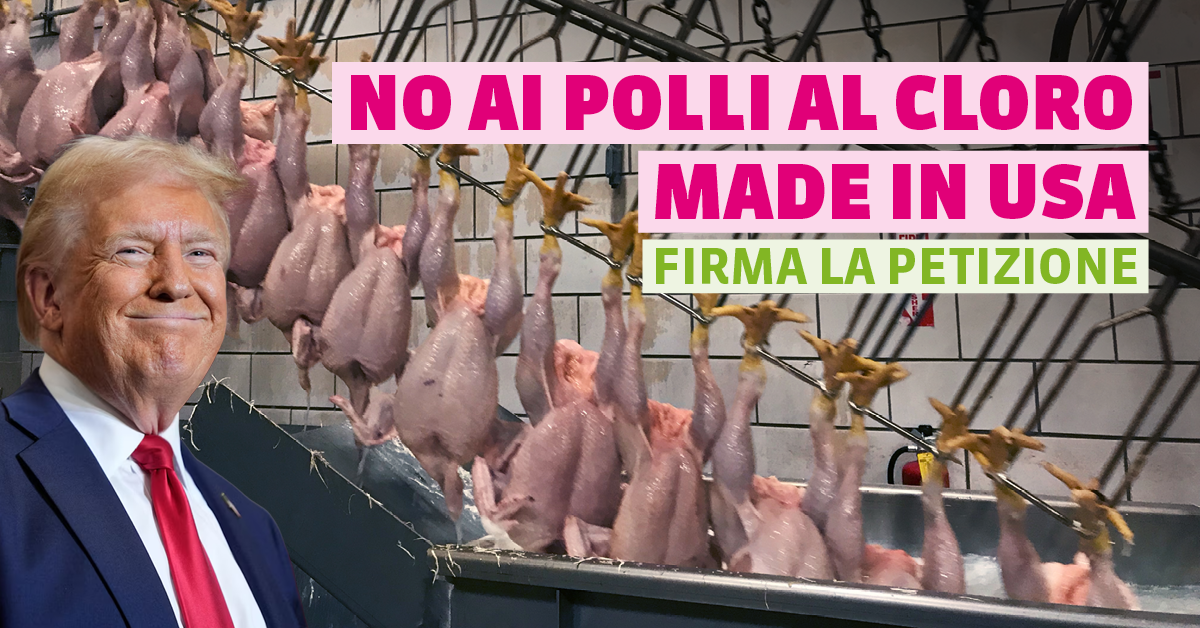 - L’accordo doganale con Donald Trump apre le porte all’importazione di pollo clorato e carne bovina trattata con ormoni provenienti da allevamenti intensivi statunitensi, prodotti secondo standard di benessere animale, ambientali e igienici nettamente inferiori.