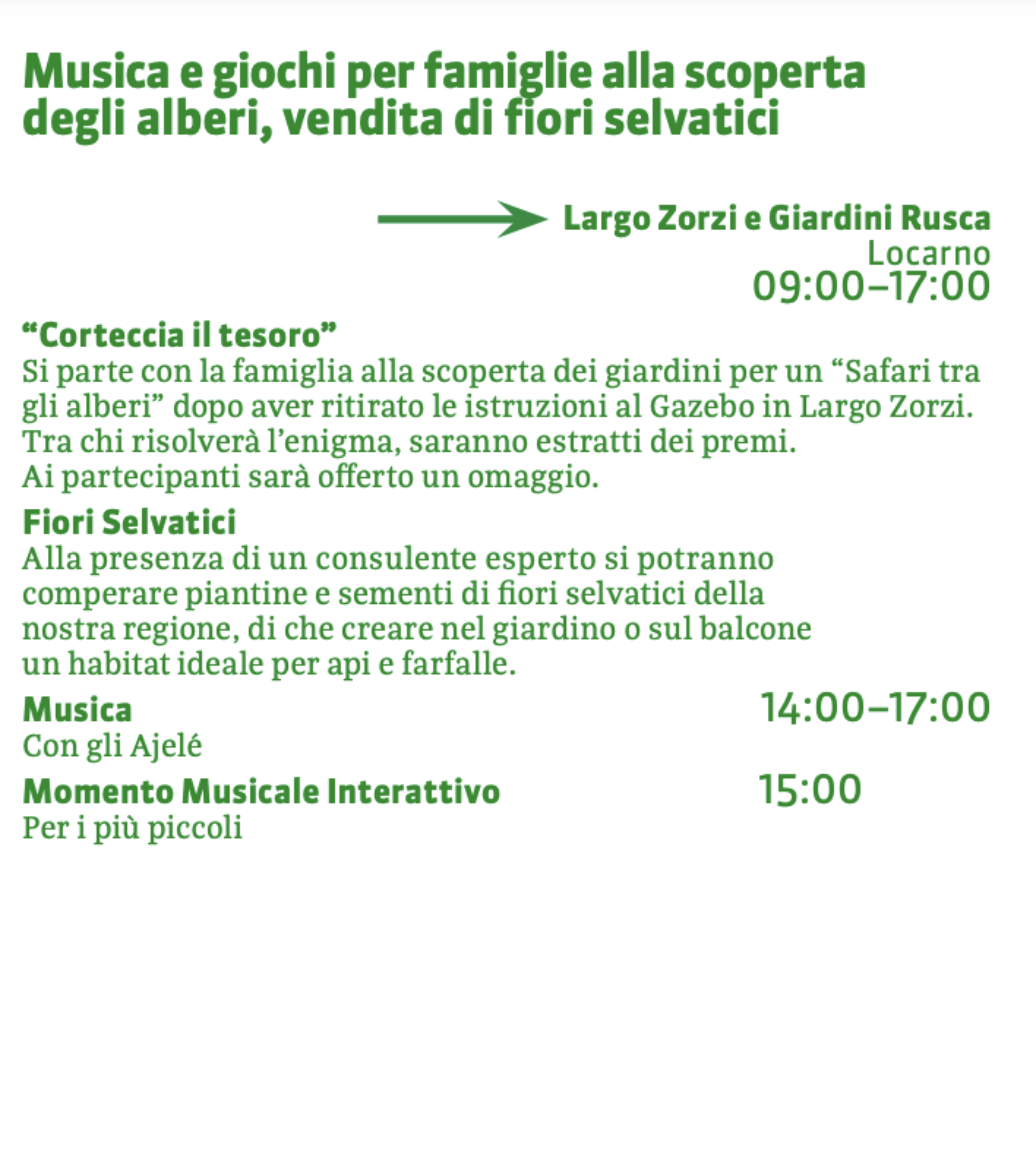 Animazioni e giochi per famiglie alla scoperta degli alberi, vendita di fiori selvatici e prodotti locali.